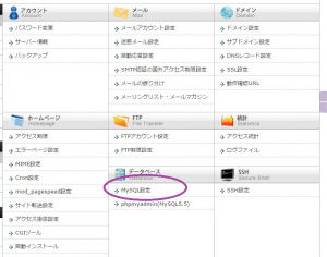 次にデーターベースのバックアップは、同じサーバーパネルの【データベース】にある【MySQL設定】設定をクリックします。